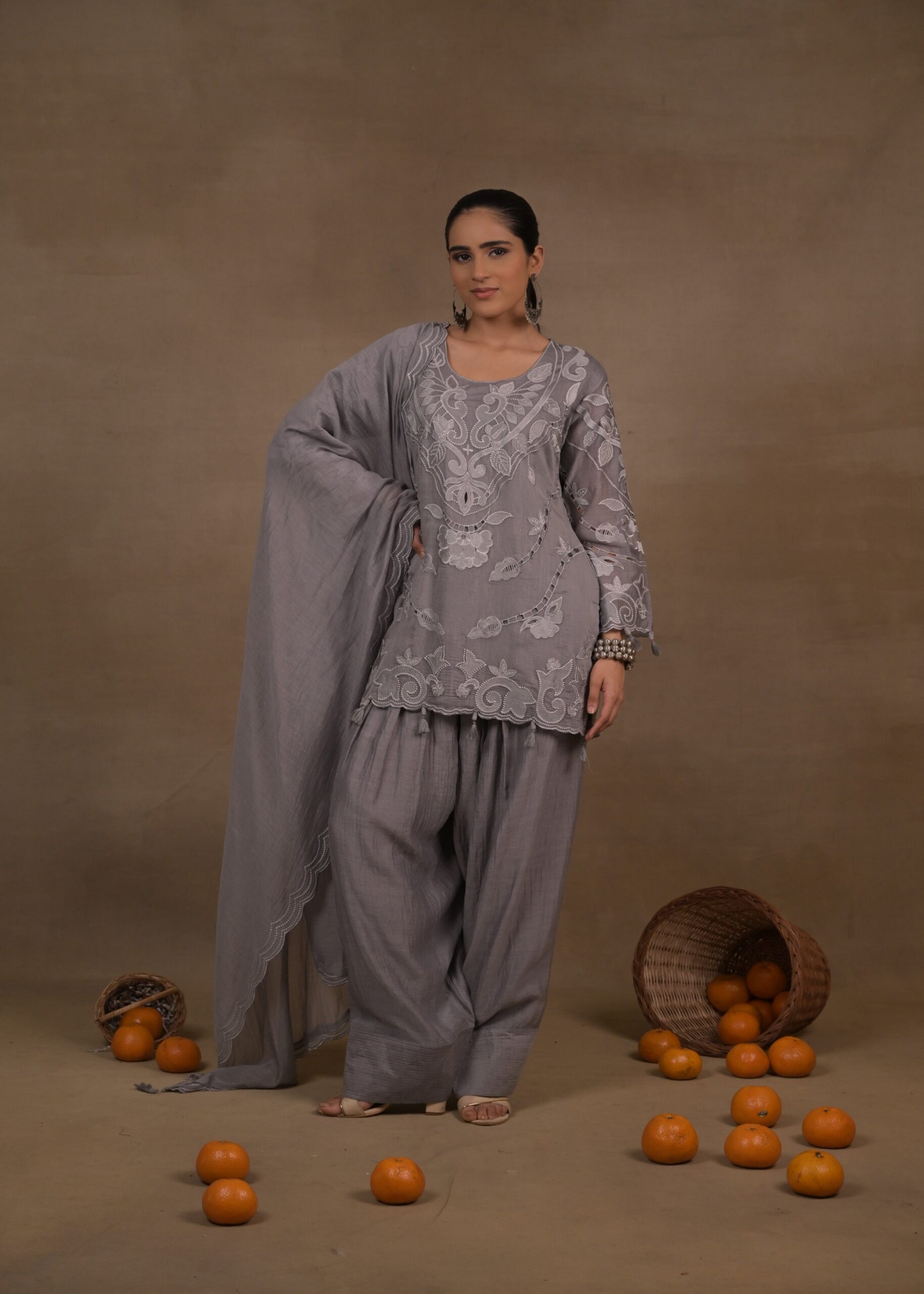 Kurta Detail: This graceful grey kurta is crafted in a relaxed, straight silhouette designed for effortless elegance and comfort. The neckline, sleeves, and hemline are adorned with intricate white thread embroidery, showcasing a sophisticated garden of floral and vine motifs. The artistic cutwork detailing along the sleeve cuffs and hem adds a modern edge.