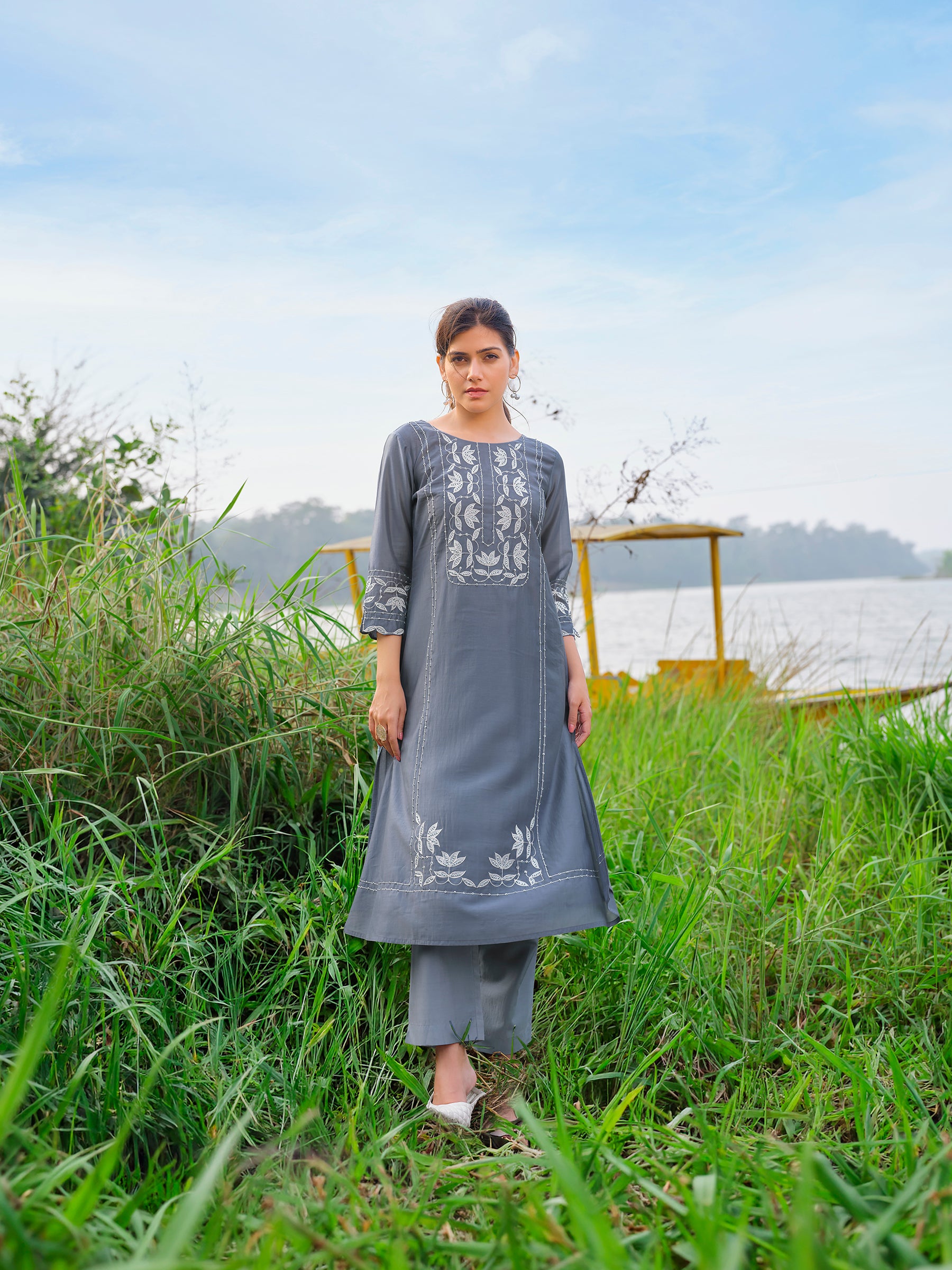 Step into sophisticated everyday style with this slate blue Chanderi silk kurta set, featuring structured white thread embroidery for a refined look.