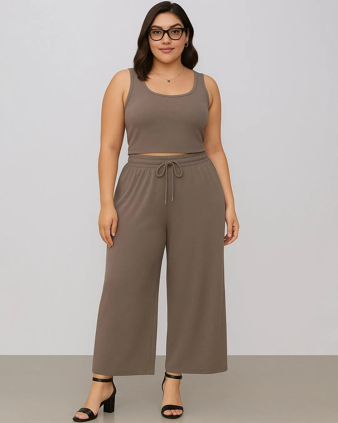It comes with a sleeveless crop top and loose, wide-leg pants with a drawstring waist ? giving you a relaxed yet trendy look. Made from a soft mix of cotton and polyester, it feels light and comfy on the skin, perfect for sunny days or in-between weather. A simple, classy set you?ll love wearing again and again!