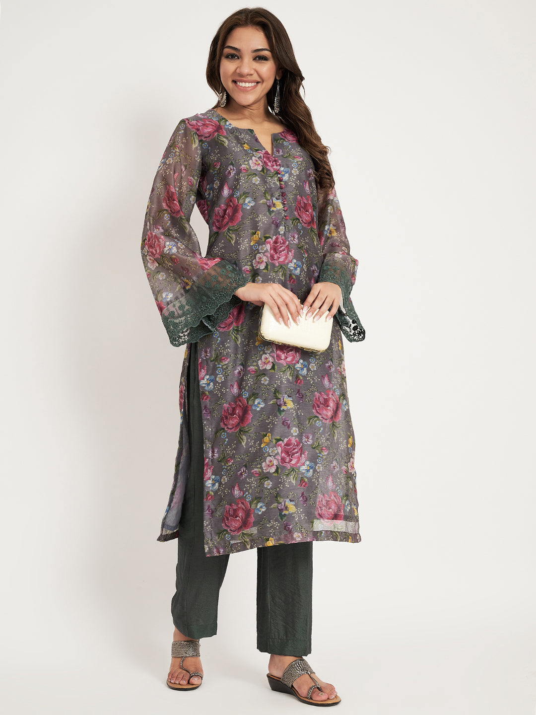 Smoky Grey Printed Straight Kurti with Straight Pants