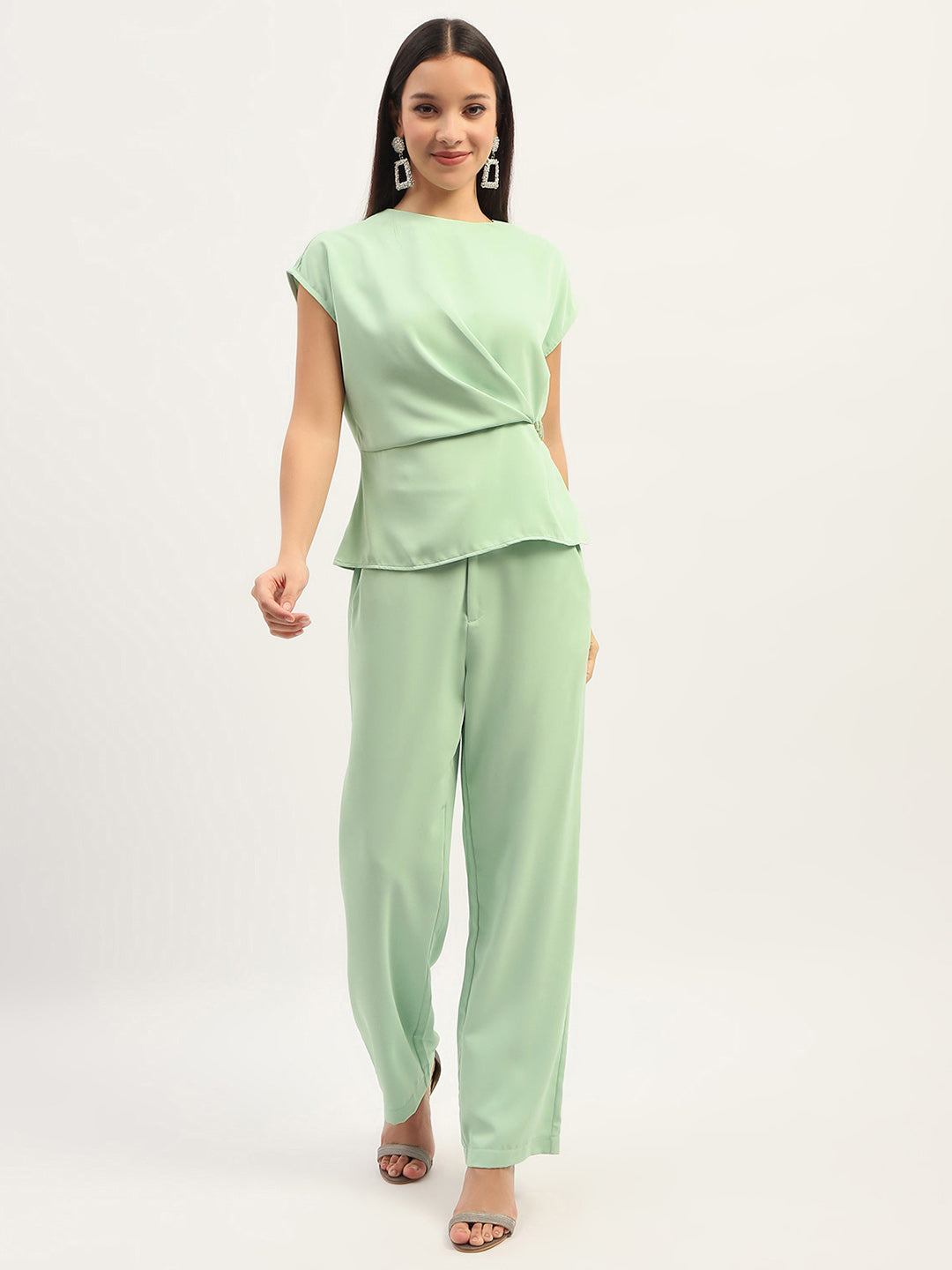 The light green hue creates a fresh, modern aesthetic, while the clean lines and flowing silhouette offer a flattering and comfortable fit. The peplum-style top adds a touch of feminine flair, while the wide-leg pants provide a streamlined and elongating effect. This versatile set can be easily dressed up or down, making it a versatile option for a variety of occasions, from casual daytime events to more formal gatherings. With its high-quality materials and impeccable construction, this chic two-piece set is a must-have addition to any fashionable wardrobe.