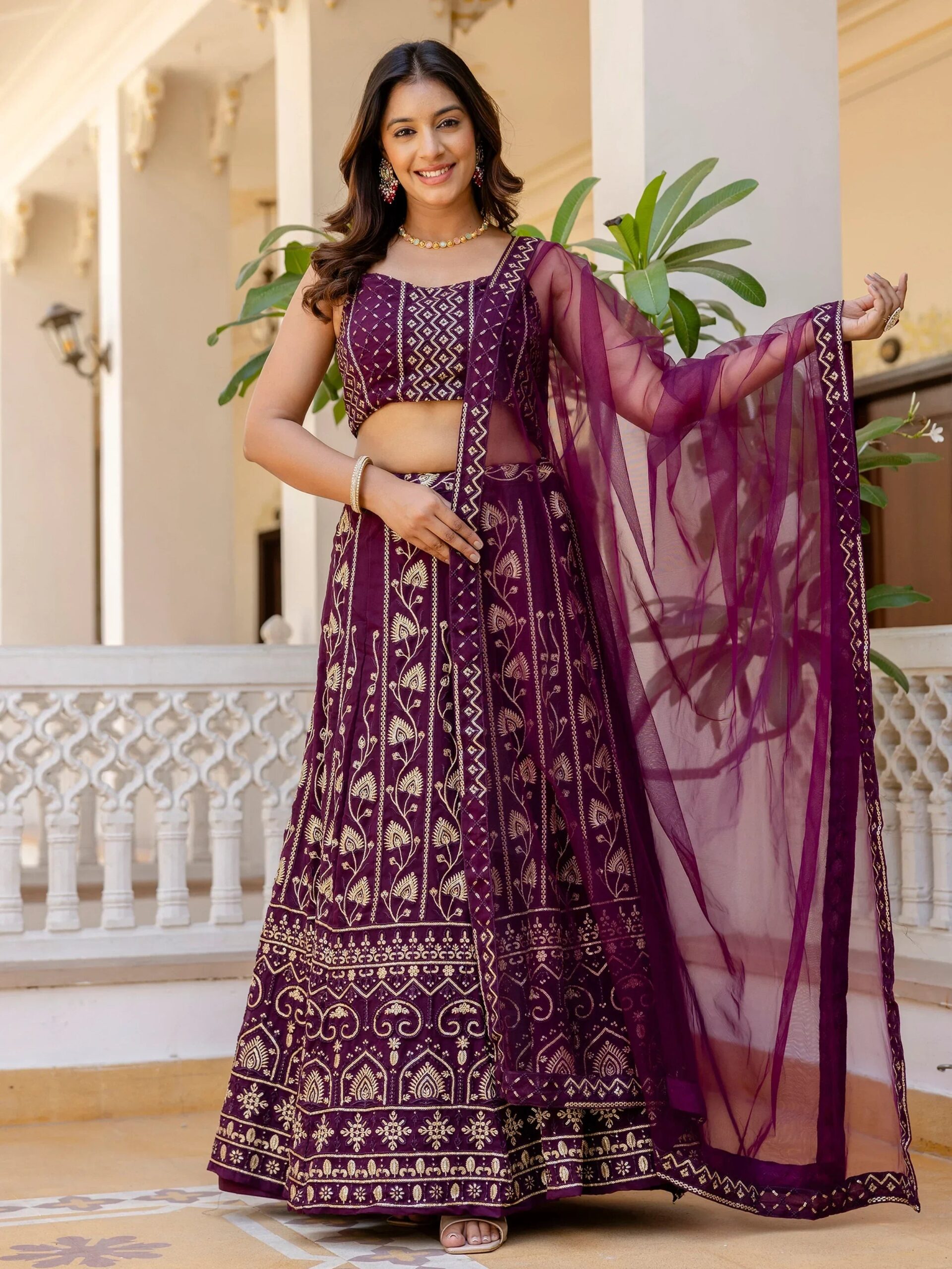 This wine color georgette lehenga is adorned with delicate sequins and thread embroidery for a festive sparkle. It comes with a 3-meter flair and is stitched with a micro cotton inner, canvas, and can-cane for added volume.