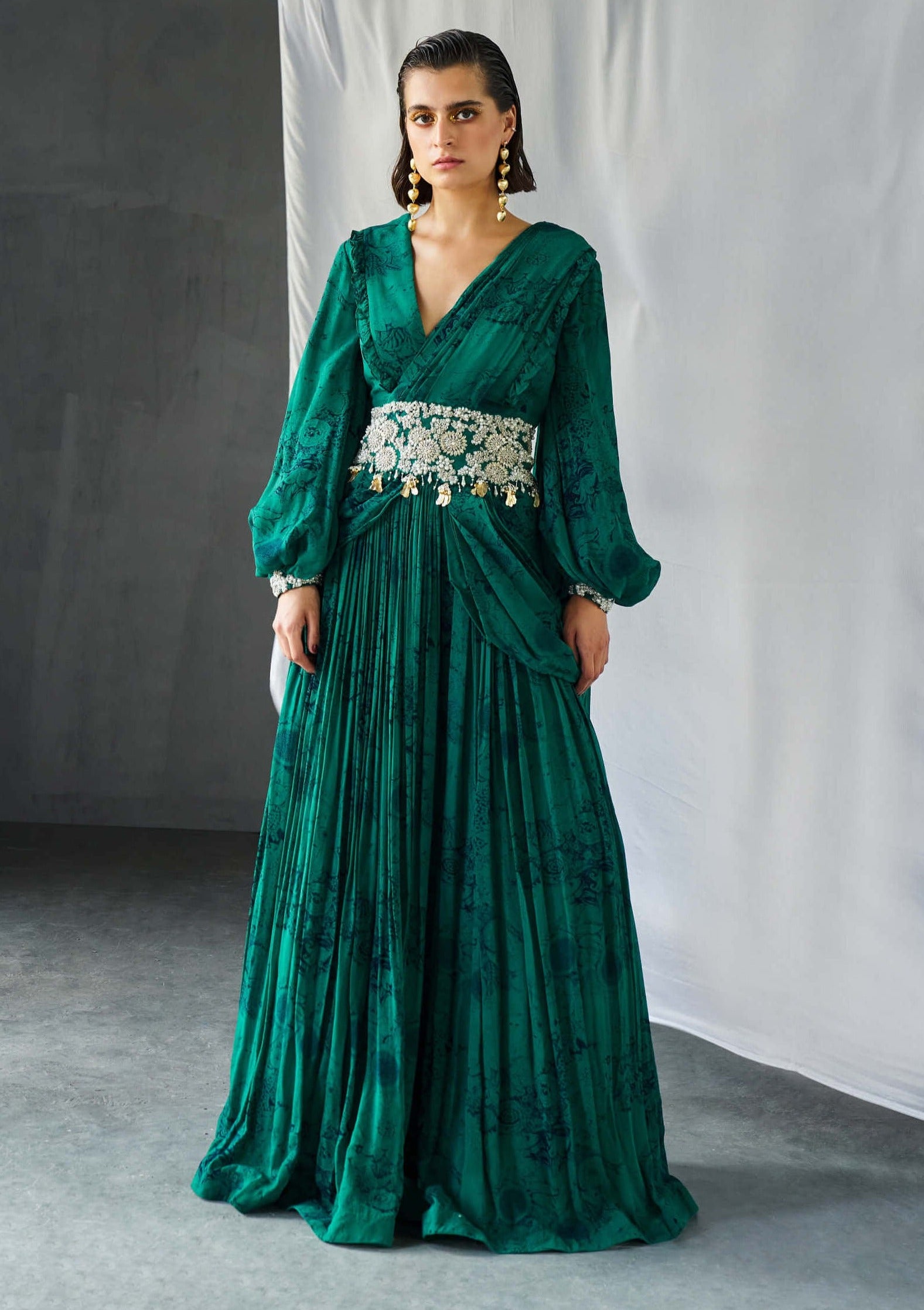 Presenting a captivating ensemble: our teal and black blossom print pallazo Saree, elegantly adorned with an embroidered cutwork belt. This unique fusion of a Saree and palazzo pants is a celebration of modern style and sophistication, perfect for making a fashion statement at any occasion.