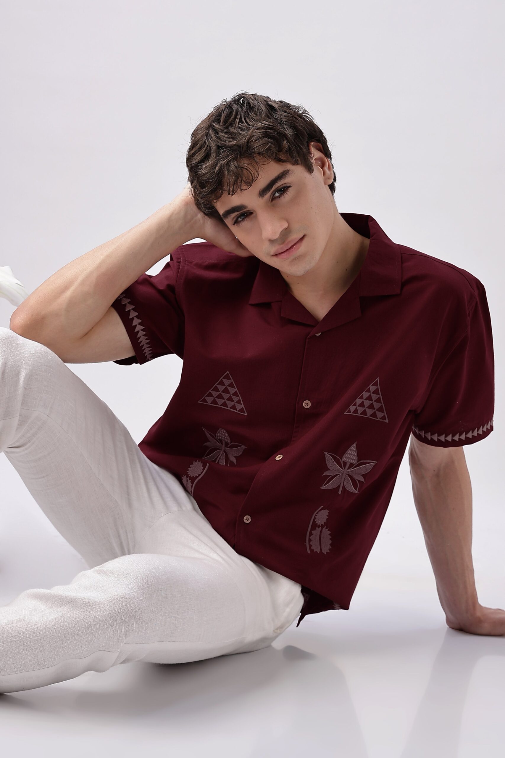 Maroon cotton shirt featuring temple trail cultural embroidery. A rich casual piece blending reassurance, tradition, and modern comfort.