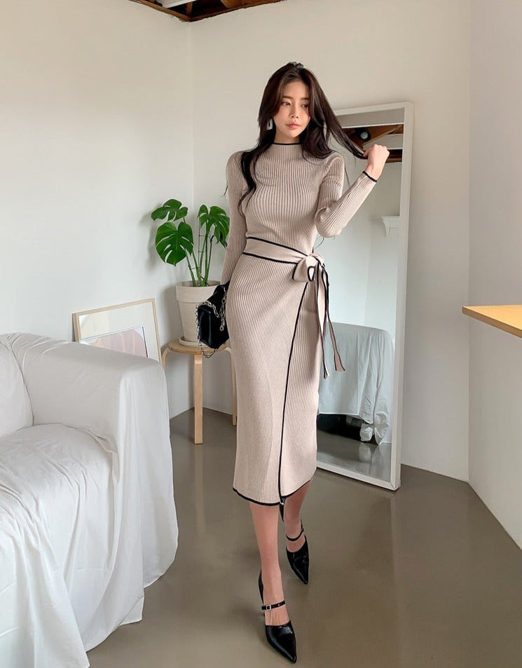 Waistline: EmpireStyle: VintageSleeve Style: RegularSleeve Length(cm): FullSilhouette: A-LinePattern Type: SolidNeckline: O-NeckMaterial: Acetate, AcrylicFabric Type: KnittingLength: Mid-CalfDecoration: BeltClosure Type: Pullover
