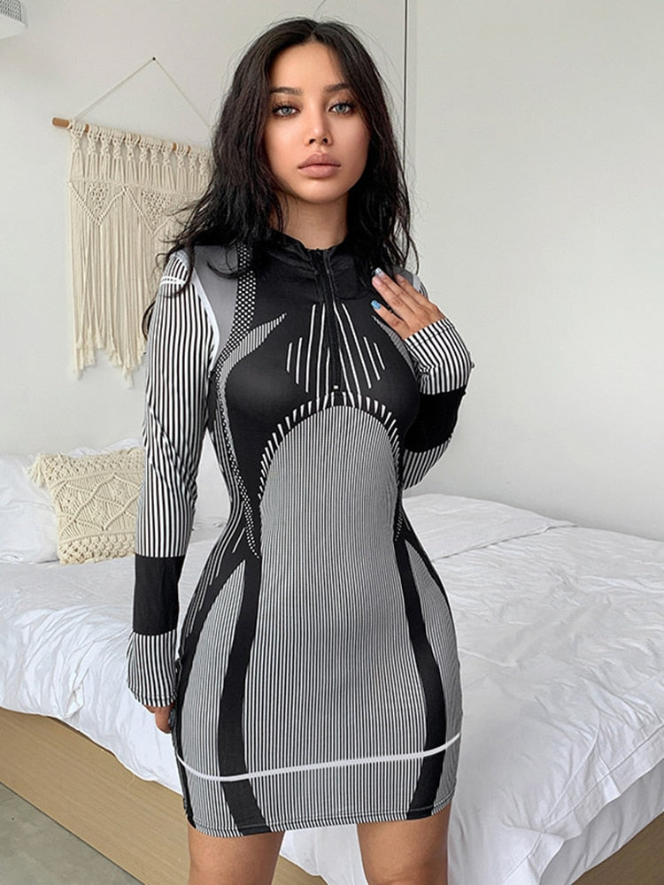 Waistline: Natural Factors Style: Streetwear Sleeve Style: Regular Sleeve Length: Full Silhouette: Sheath Pattern Type: Print Neckline: O-Neck Material Composition: Synthetic fiber Material: Polyester, Spandex Fit Type: Slim Fit Fabric Type: Knitting Elasticity: High Stretch Dresses Length: Above Knee, Mini Decoration: Printing Closure Type: Pullover