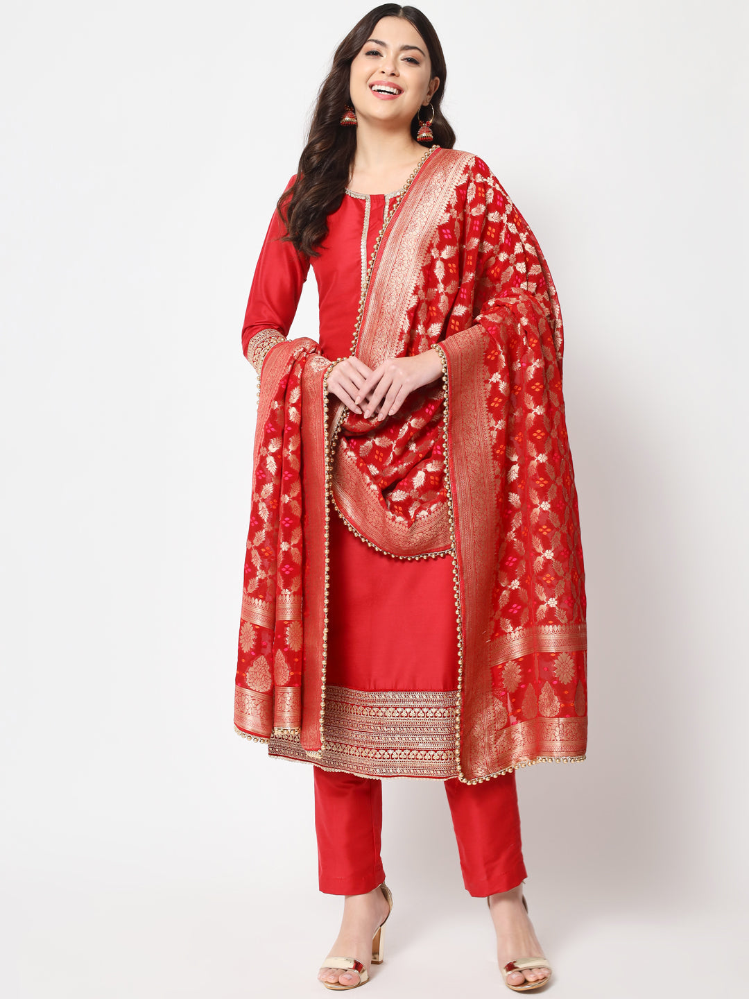 Home Suit Set Traditional Bridal Red Embroidered Straight Kurti with Pants and Dupatta