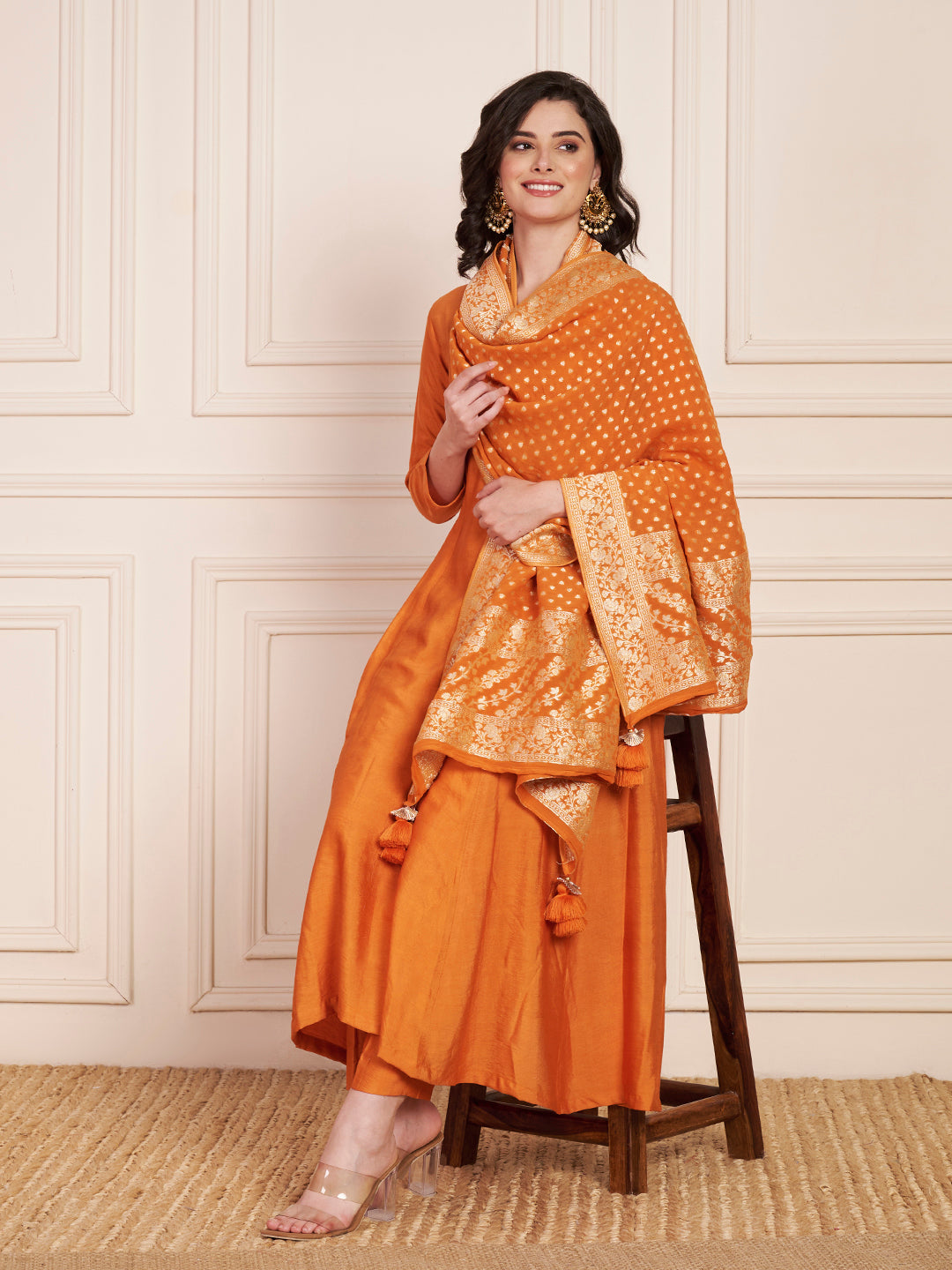 Home Suit Set Unique Orange Anarkali Kurti with Pants and Weaved Georgette Dupatta