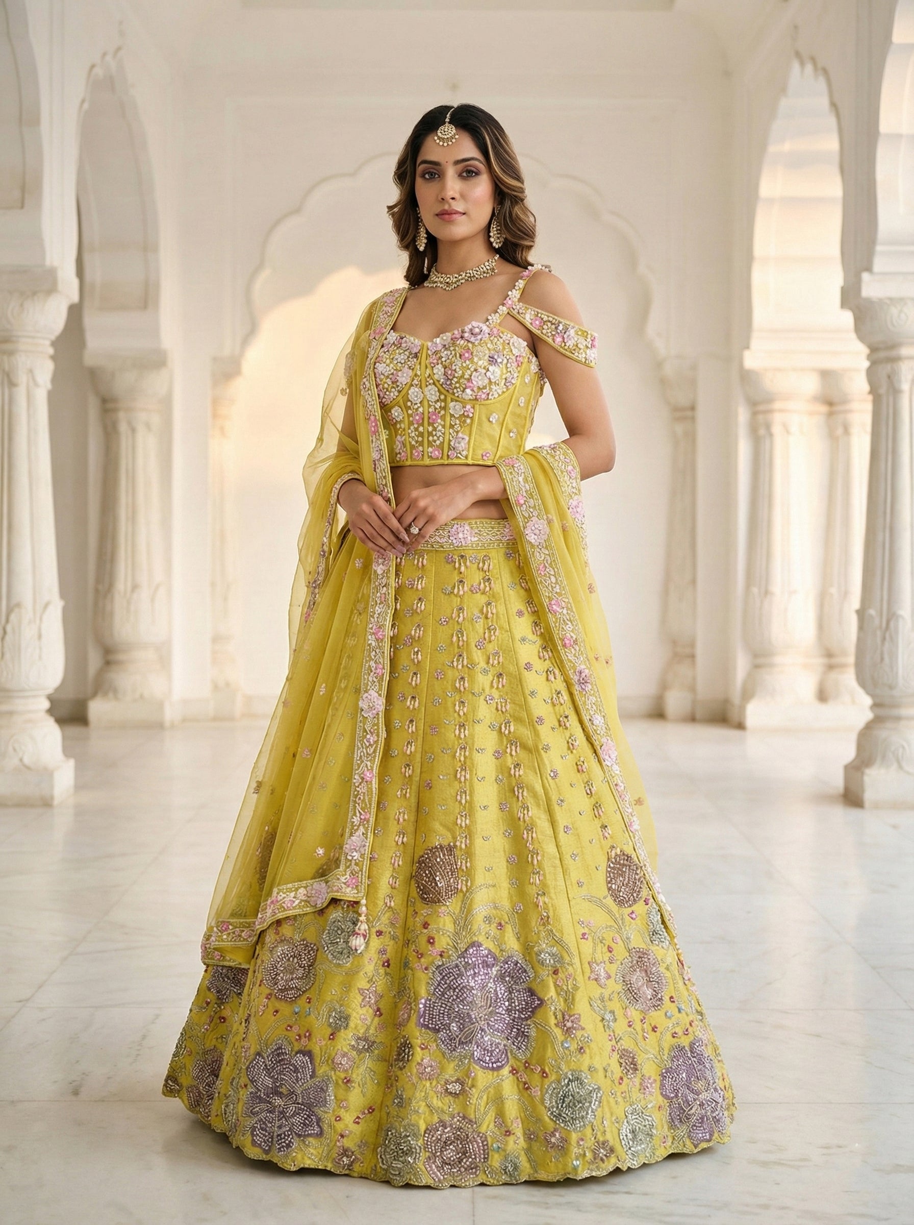 Elevate your festive wardrobe with this exquisite Variyali Green Tissue Ghagra Set, a masterpiece of traditional craftsmanship. Crafted from luxurious tissue fabric in a sophisticated green hue, this ensemble features intricate hand embroidery that showcases meticulous artistry. The voluminous ghagra silhouette offers graceful movement and timeless elegance, while the heavy embellishments add richness and dimension. Perfect for weddings, celebrations, and special occasions, this set combines heritage techniques with contemporary styling. The breathable tissue fabric ensures comfort throughout your event, making it an ideal choice for the discerning wearer who appreciates authentic craftsmanship and refined aesthetics.
