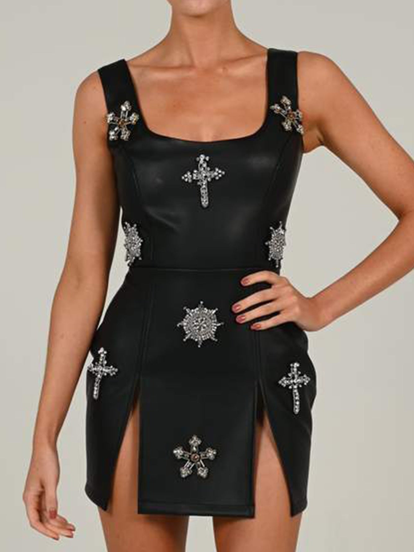 Silhouette: Sheath Neckline: Square Decoration: Metal Appliques Dresses Length: Above Knee, Mini Material: Polyester Closure Type:?Zipper Sleeve Length: Sleeveless Pattern Type: Solid