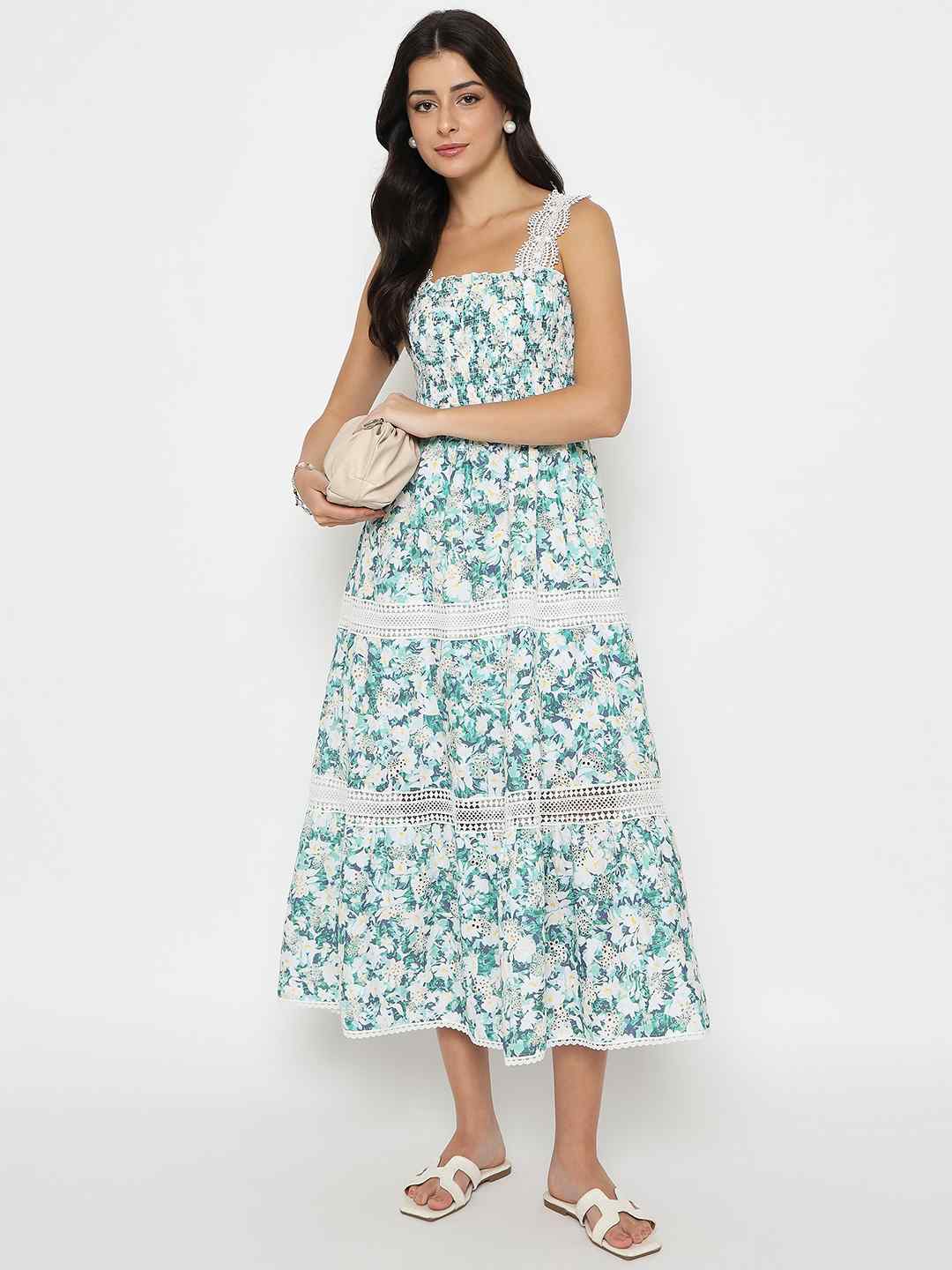 This white midi dress combines delicate lace with a soft floral print for an elegant, feminine look. Perfect for events or parties, pair with sandals or heels.