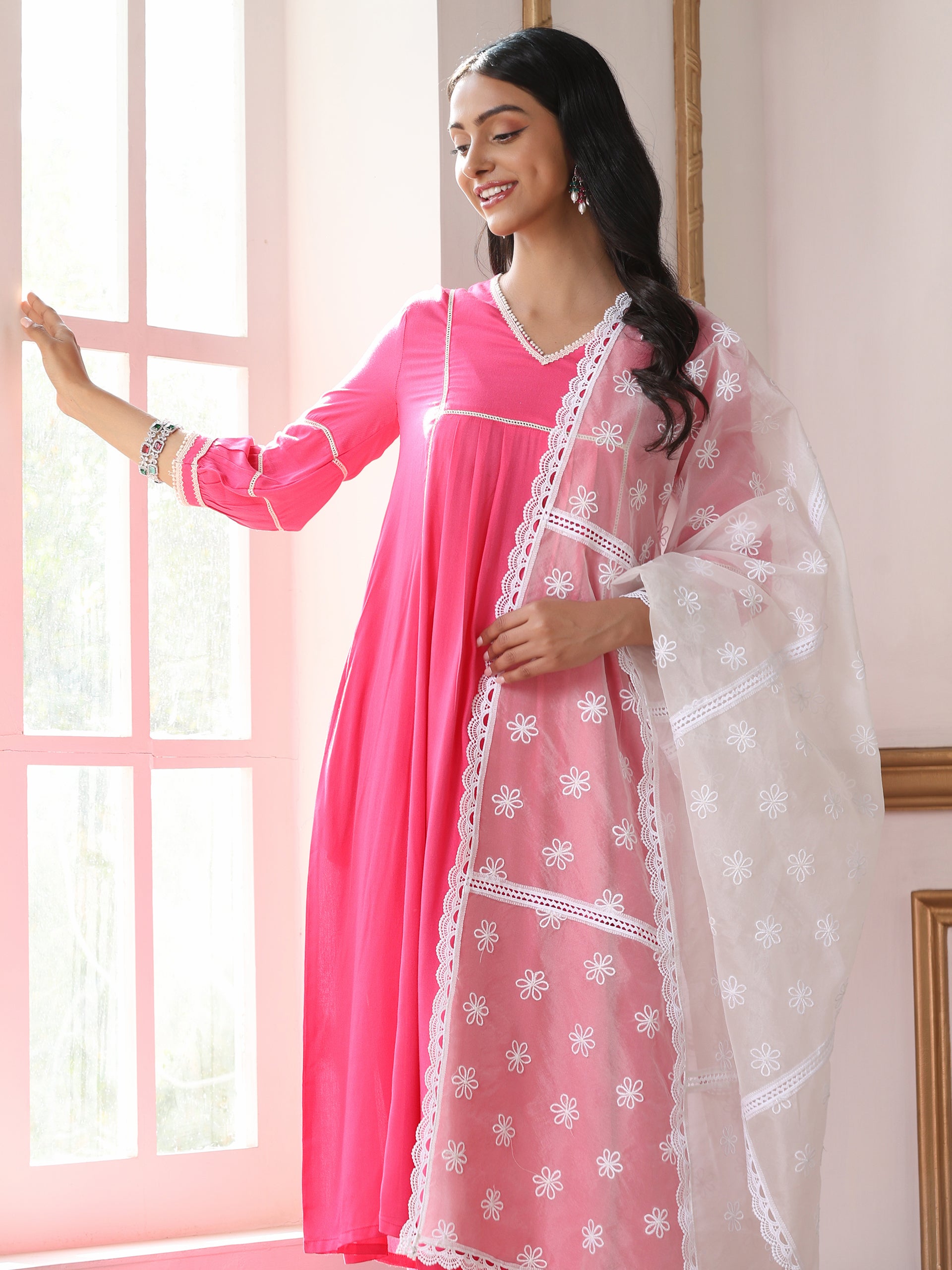 White Organza Dupatta with Floral Embroidery,”A lightweight white organza dupatta adorned with floral embroidery and lace borders.”