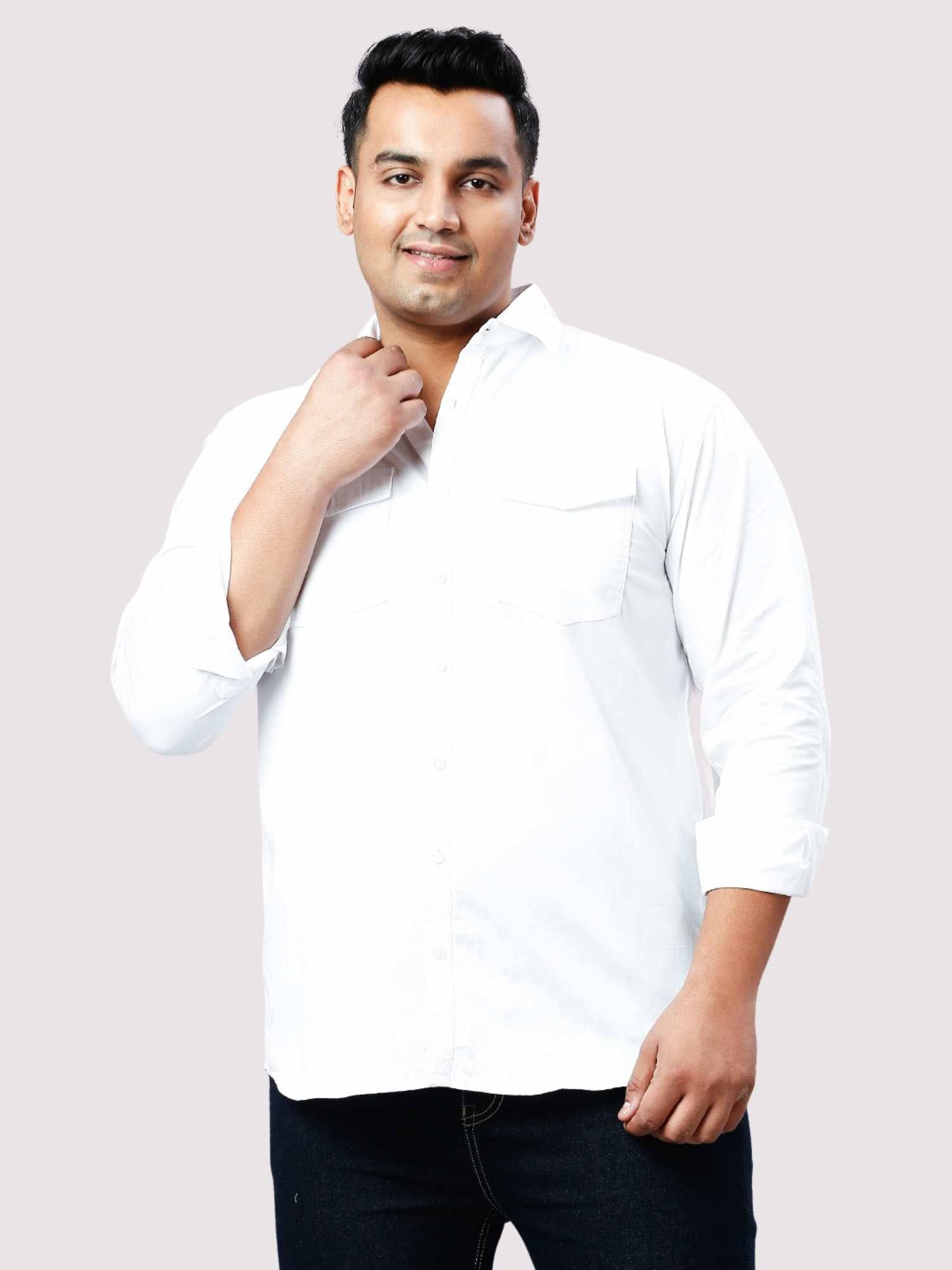 White Solid Pure Cotton Double Pocket Full Sleeve Shirt Men Plus Size