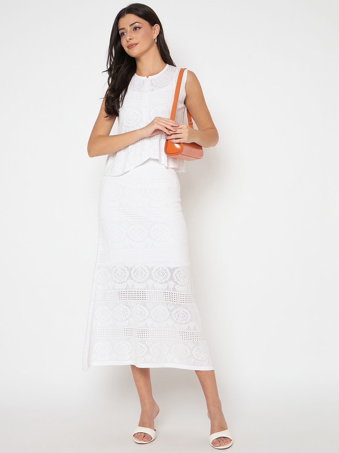 This white knitted co-ord set pairs a soft viscose-blend top with flowy wide-leg bottoms for effortless elegance. Perfect for brunches, vacations, or getaways.