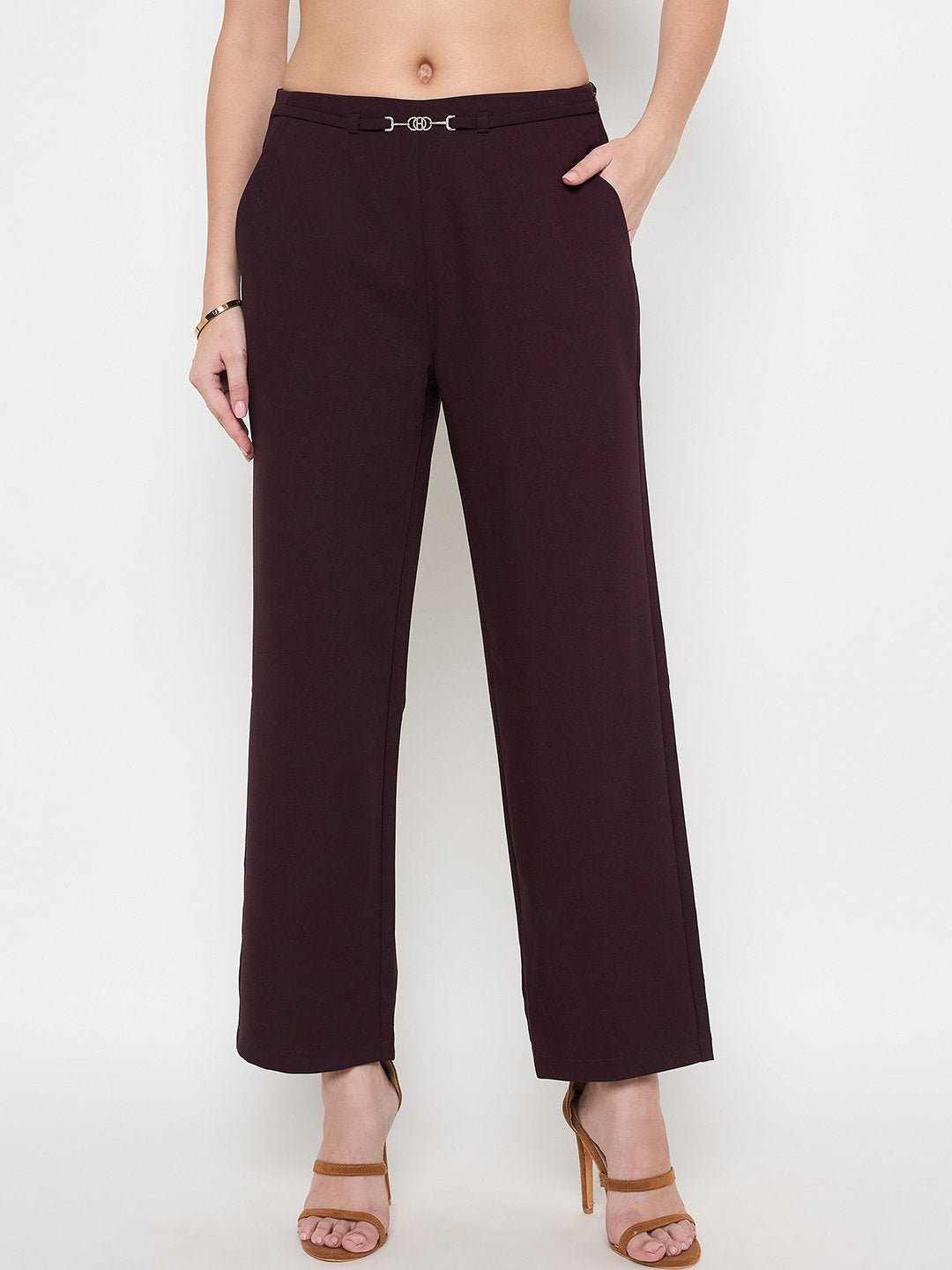 Wine Colored Belted Straight Fit Women Trousers