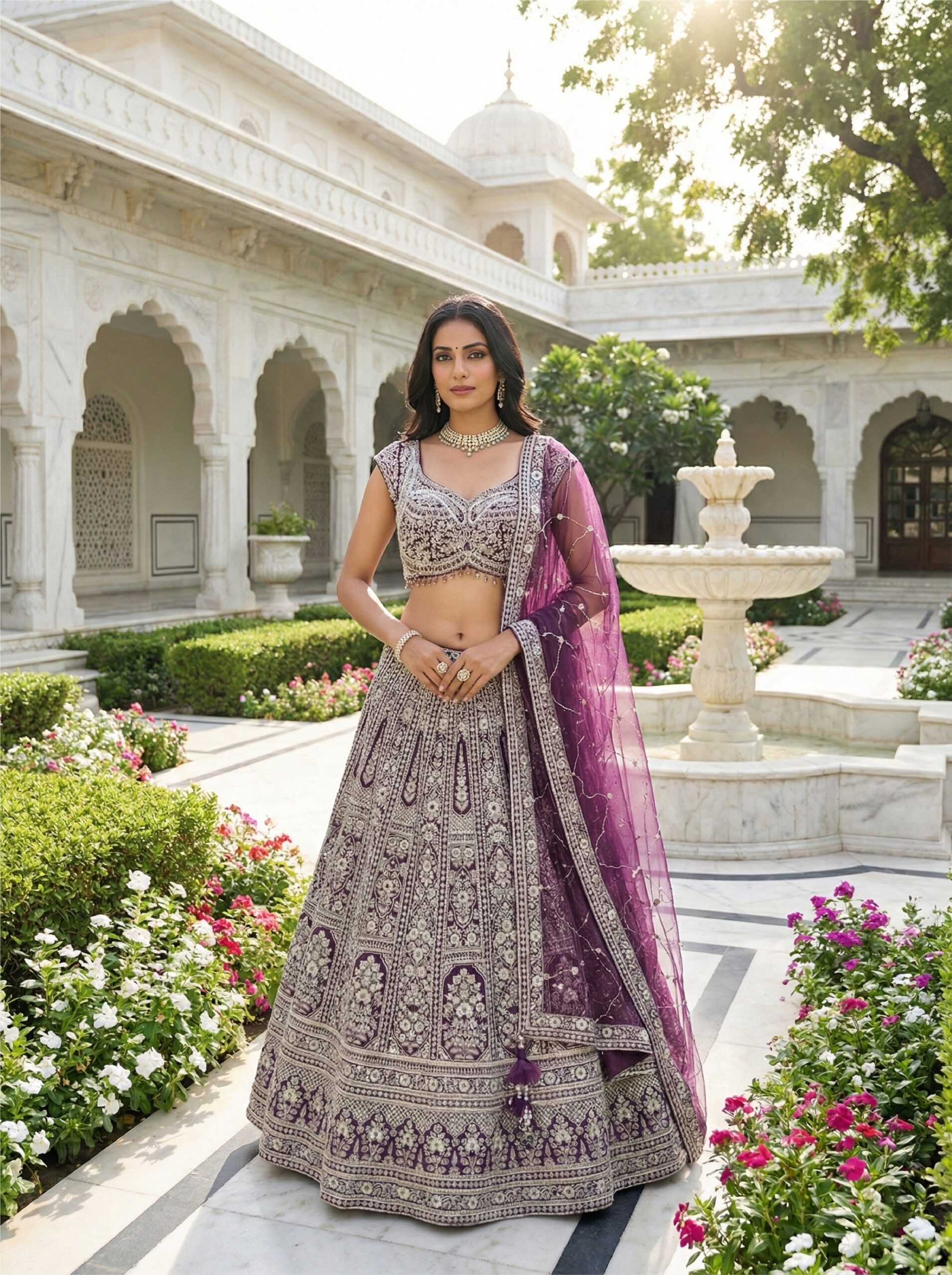 Elevate your festive wardrobe with this exquisite wine-hued ghagra set, meticulously crafted from luxurious net fabric. Each piece showcases intricate hand embroidery featuring delicate floral motifs that dance across the ensemble, creating an enchanting interplay of texture and elegance. The rich wine tone exudes timeless sophistication, making it an ideal choice for weddings, celebrations, and special occasions. The flowing silhouette of the ghagra paired with thoughtfully embroidered details ensures you’ll command attention while maintaining graceful poise. Perfect for the discerning woman who appreciates artisanal craftsmanship and refined aesthetics.