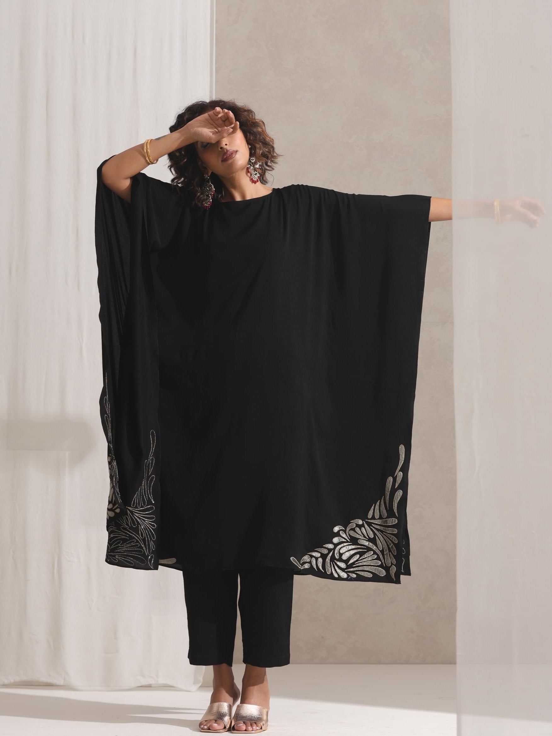 Women Black Korean Embroidered Kaftan Kurta Pyjama Set