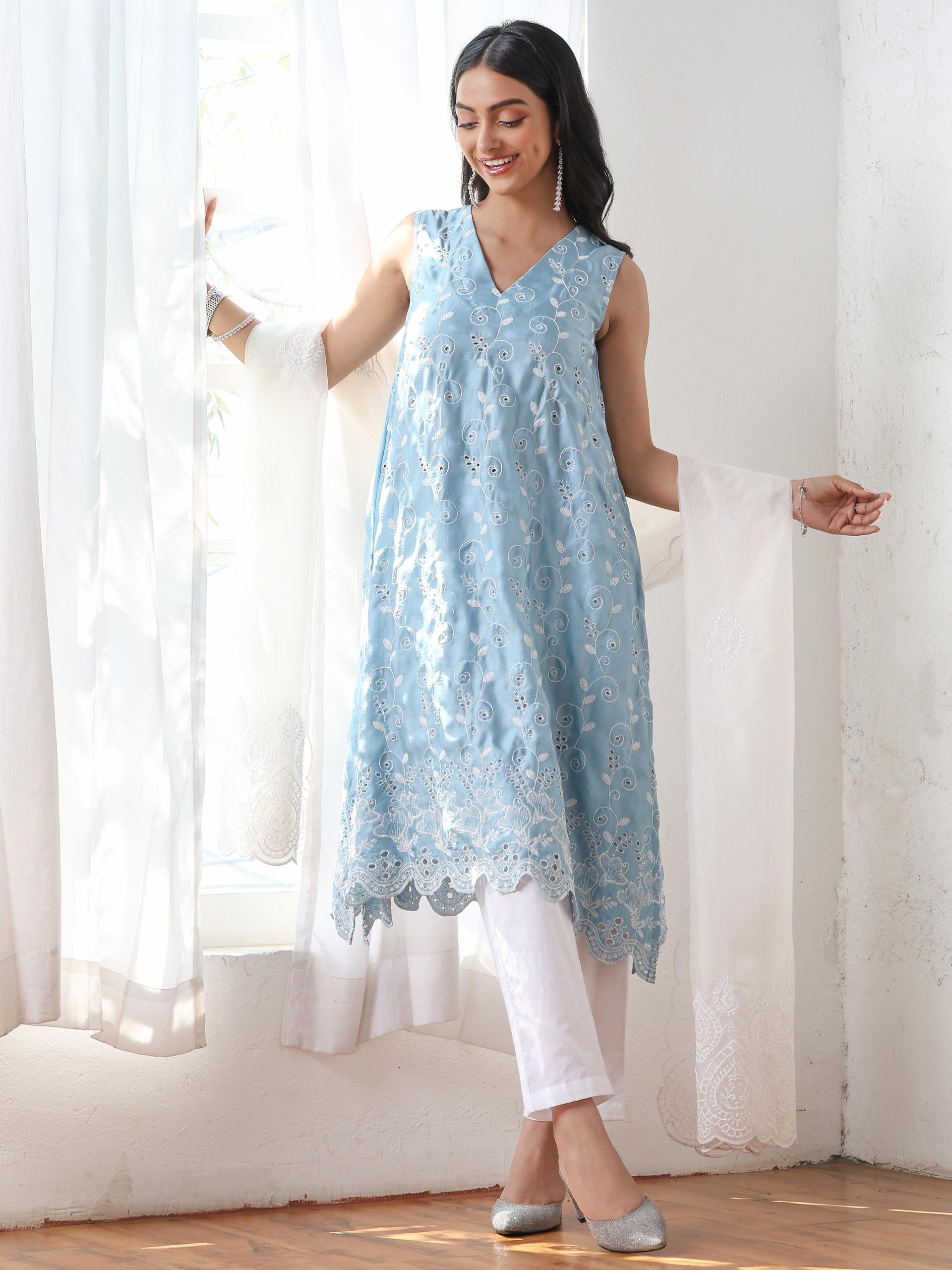 Women Blue A Line Suit Set with All Over Schiffli Embroidery and White Pant,”A blue A-line suit set with all-over schiffli embroidery paired with white pants.”