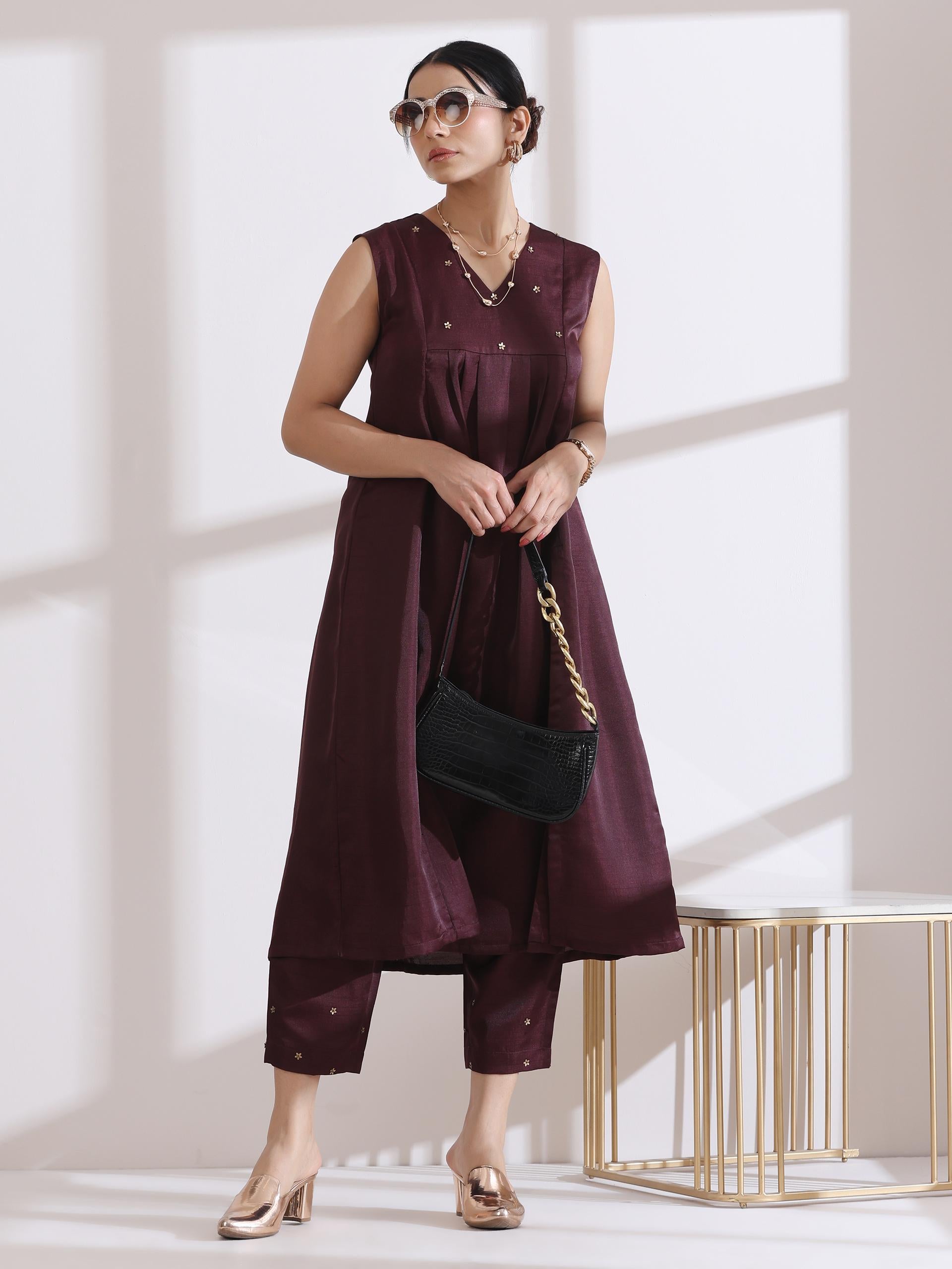 Women Chocolate Sleeveless Kurta Pant Set with Bead Detailing,”A chocolate sleeveless kurta pant set accented with bead detailing.”