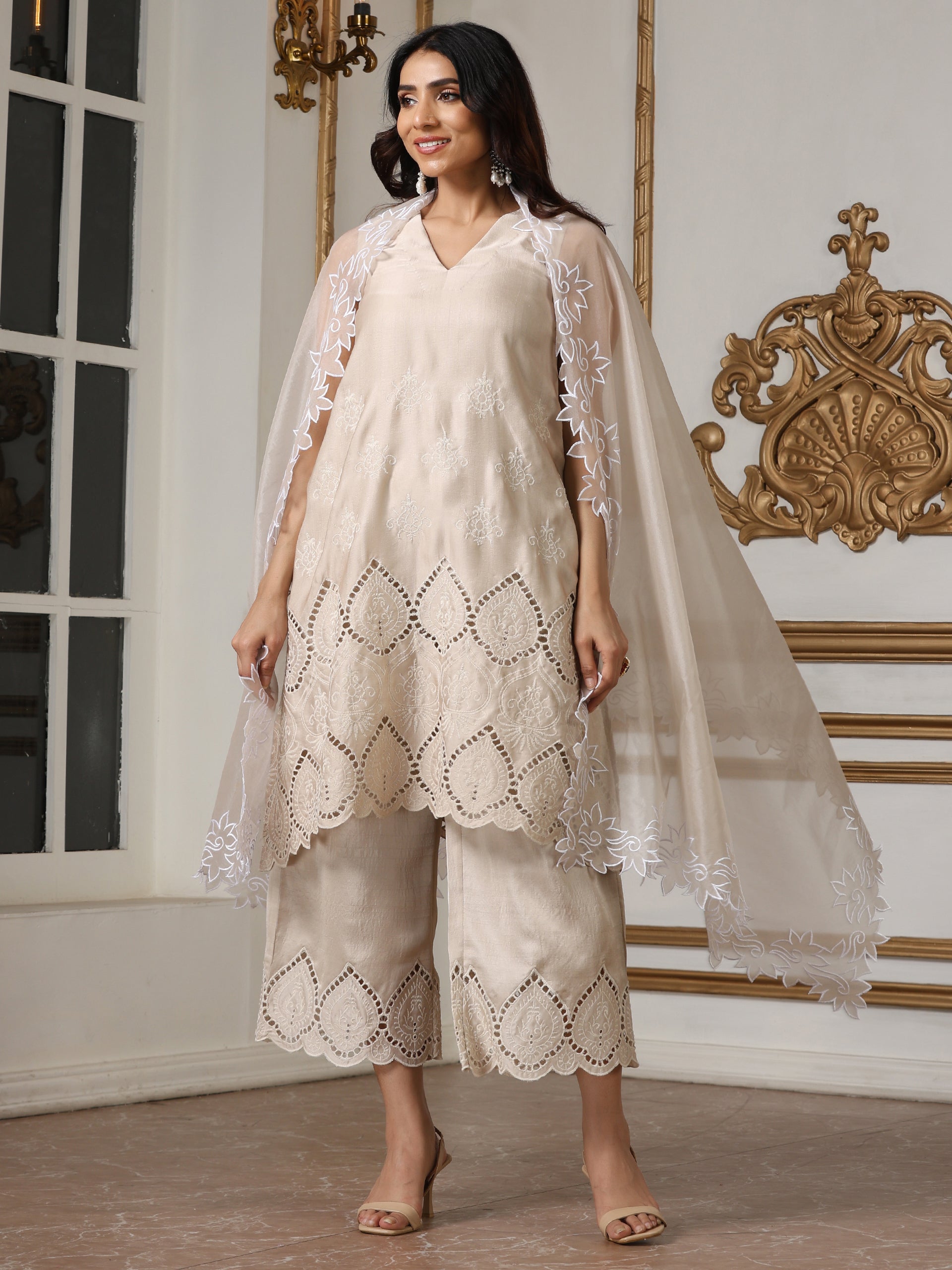 Be the first to review “Women Cream Sleeveless A Line Suit Set with Swiss Embroidery for Elegant Workwear” Cancel reply