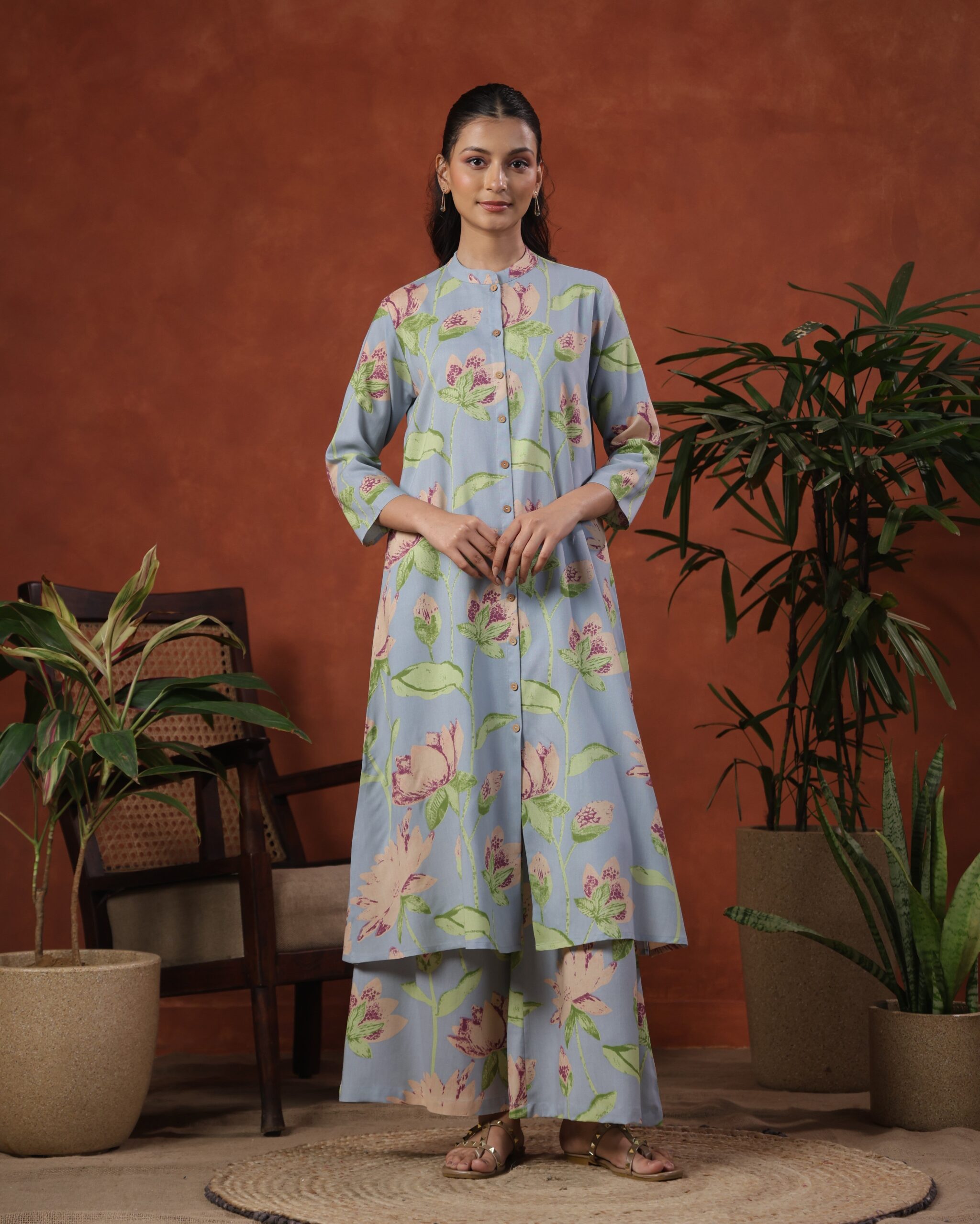 This Kurta Set has a 3/4th sleeves, flat collared, straight kurta along with a matching wide trouser having a partially elasticated waistband.