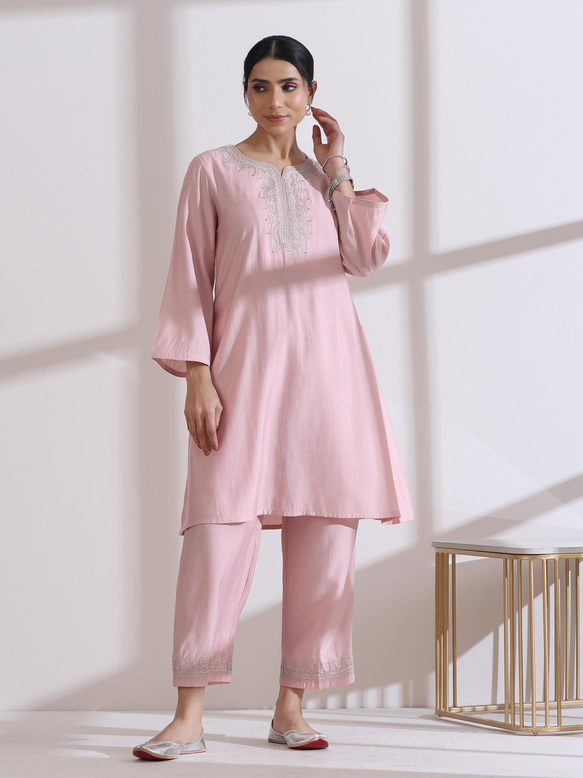 Be the first to review “Women Light Pink A Line Kurta Pant Set with Embroidered Top in AirSkin Cotton Silk Blend” Cancel reply