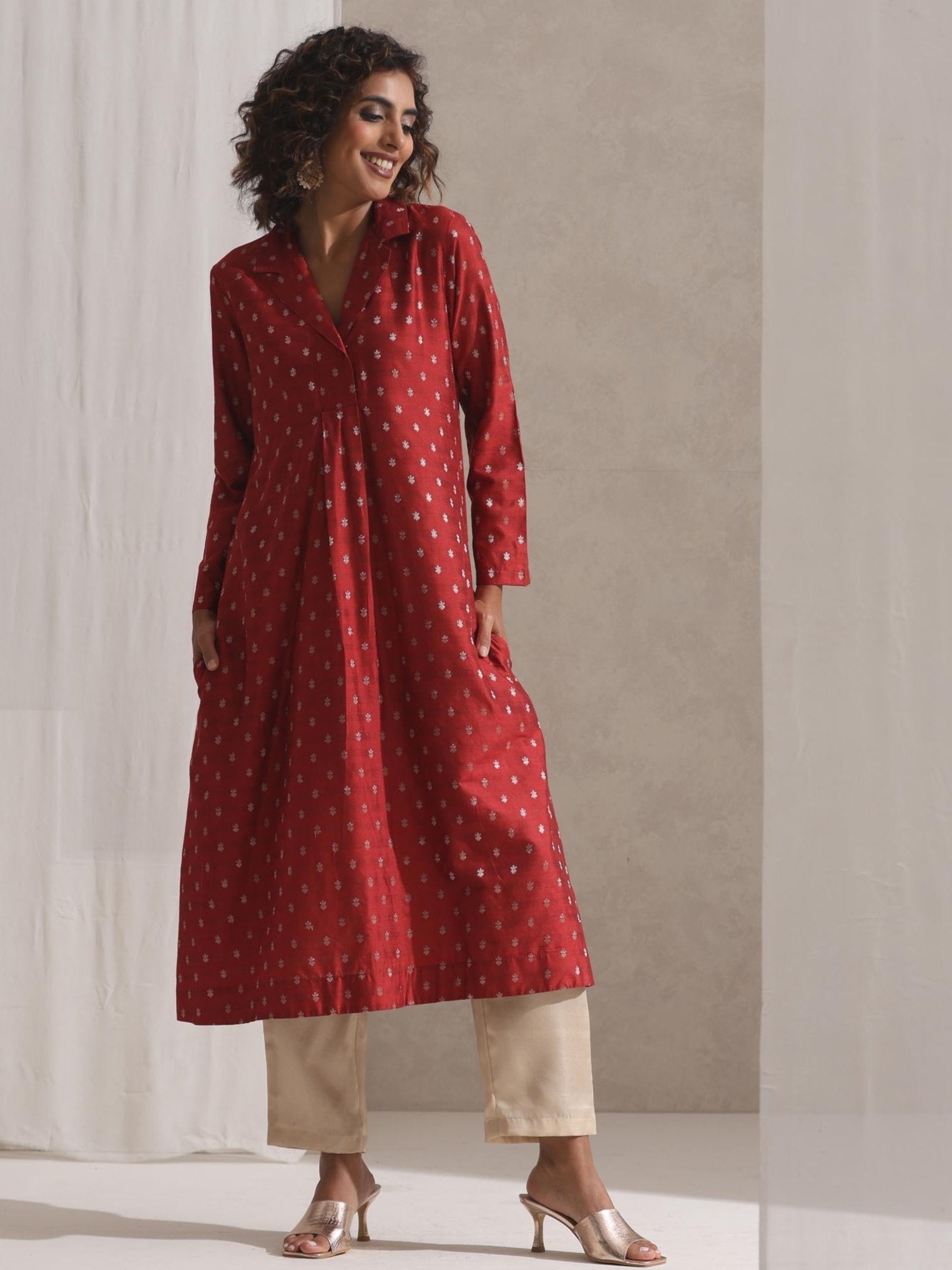 Be the first to review “Women Rust Varanasi Silk Kurta Pant Set with Woven Collar” Cancel reply