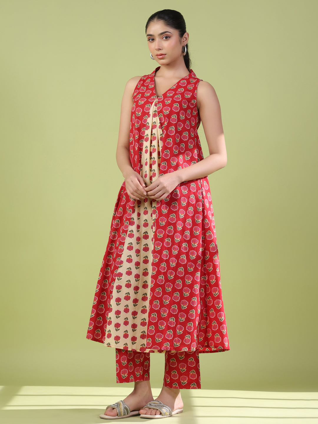 This Kurta Set has a V neck, sleeveless flared kurta with pleat detailing along with a printed trouser having a partially elaticated waistband.