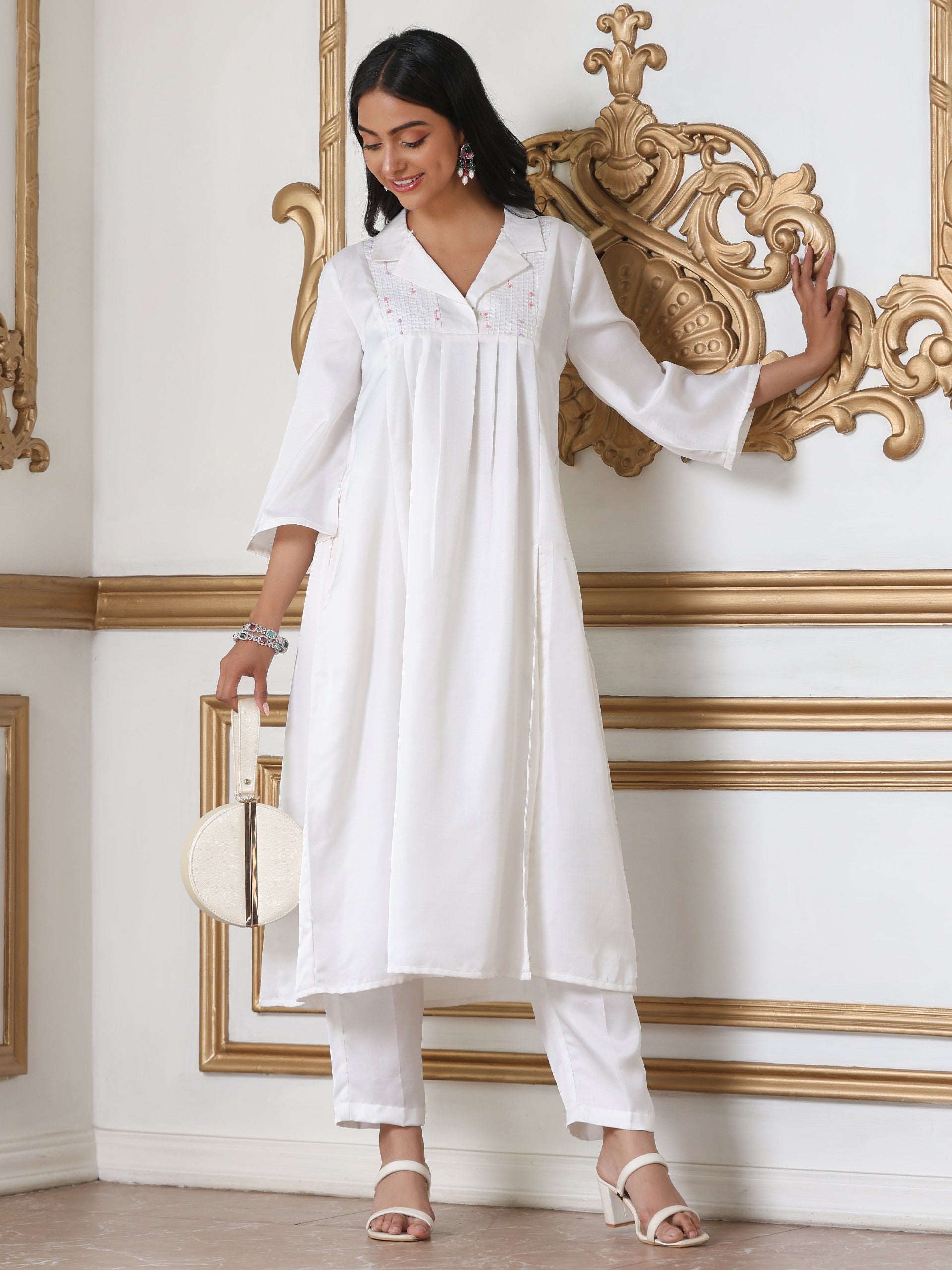 Home Suit Set Women White Paneled Lux Kurta with Hand Stitched Embroidery