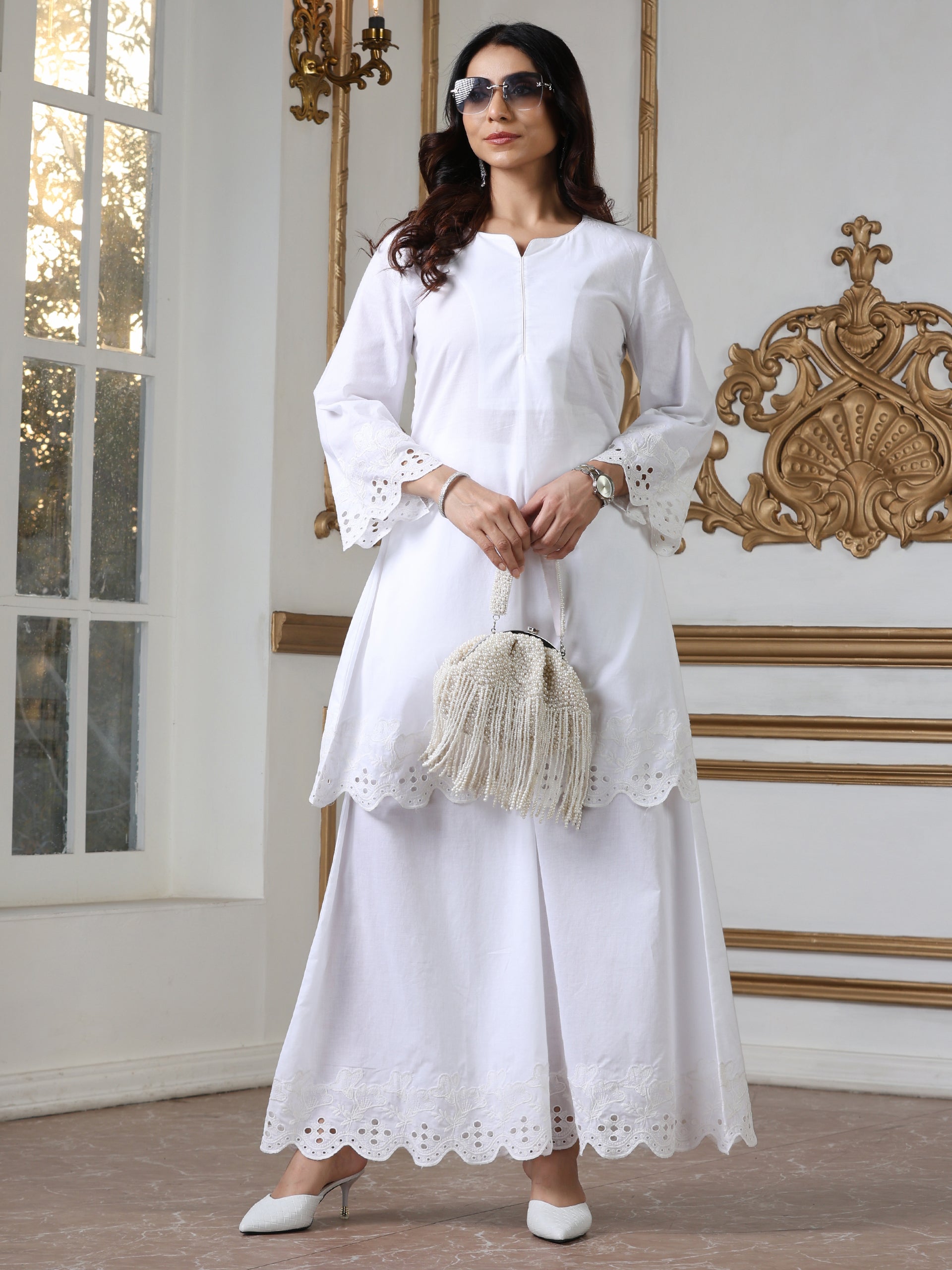 Women White Short Schiffli Kurta with Swiss Embroidery,”A white short schiffli kurta designed with Swiss embroidery.”