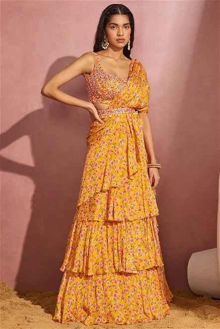 Home Saree Yellow Daisy Frill Style Saree Set for Women Festive Wear