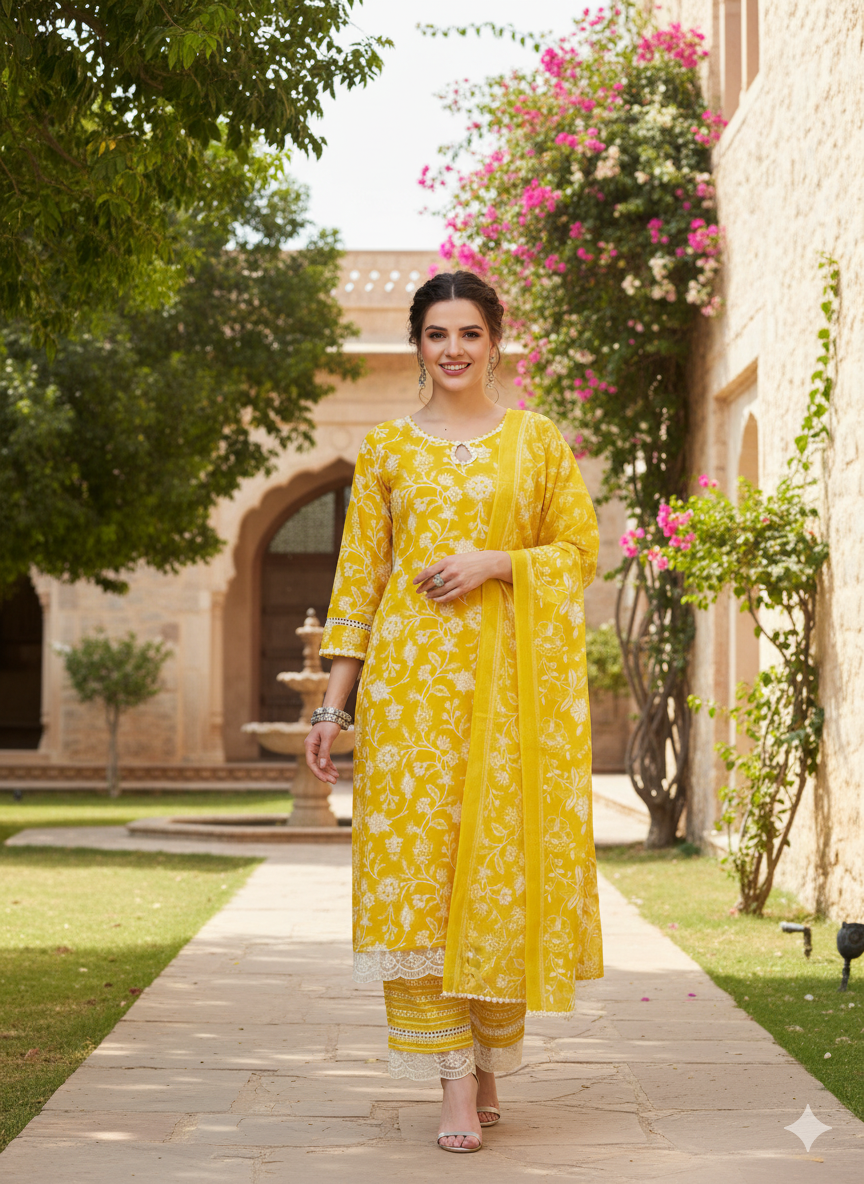 Yellow Floral Print Embroidered Cotton Kurta & Dupatta Set