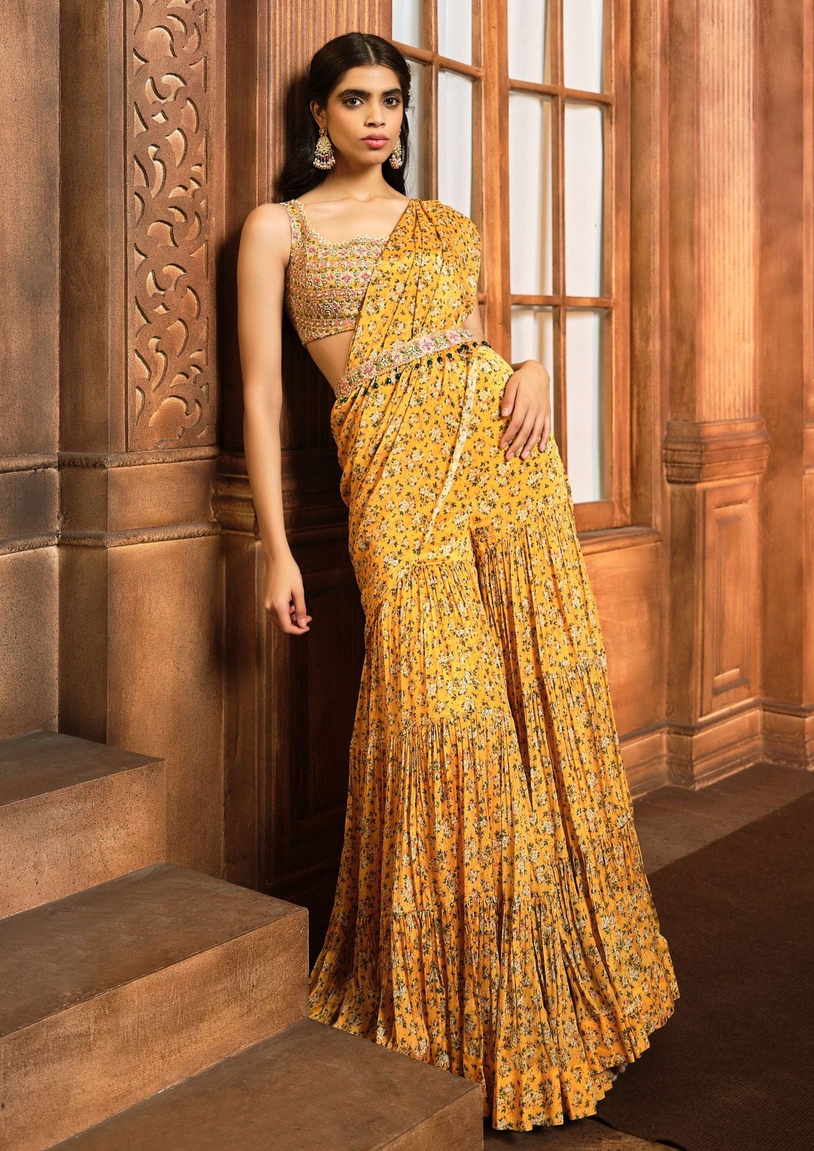 Home Saree Yellow Floral Sharara Style Draped Saree Set for Women