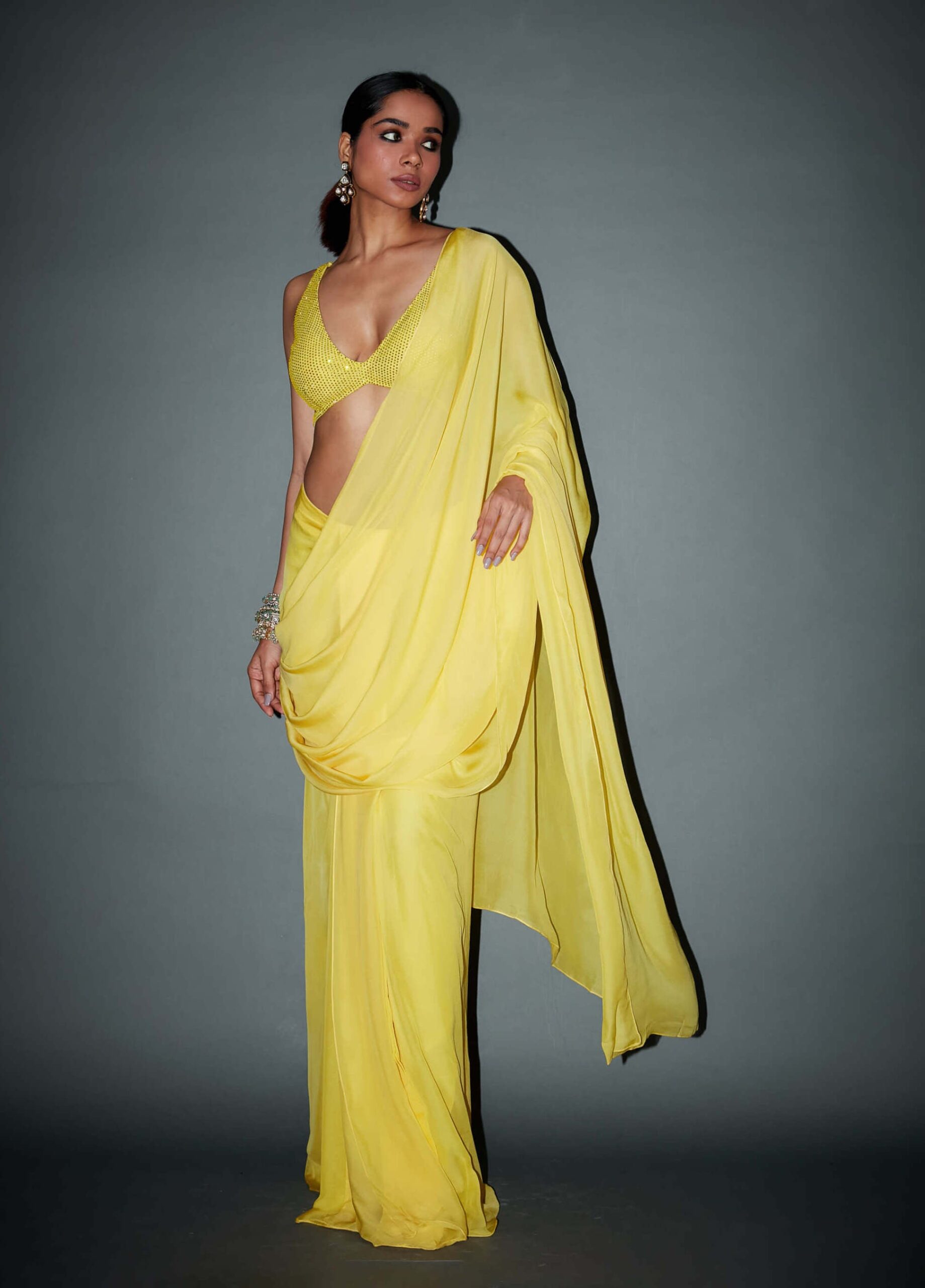 Introducing our yellow crystal embellished blouse paired with predrape Saree. This exquisite ensemble combines a beautifully embellished blouse adorned with shimmering crystals and a predraped?Saree for a truly stunning look. The vibrant yellow color and intricate embellishments add a touch of glamour and elegance to your attire. Perfect for special occasions and events, this ensemble will make you shine and stand out with its unique and sophisticated design.
