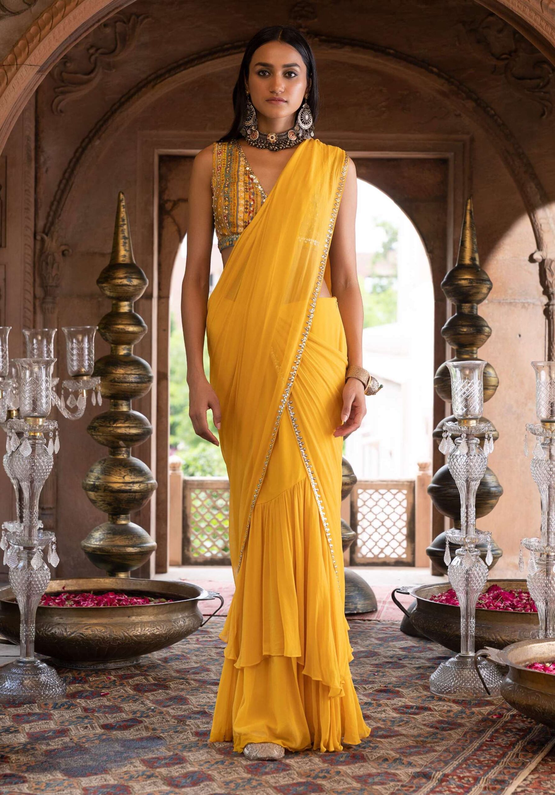 Home Saree Yellow Pre Draped Saree with Blouse for Women